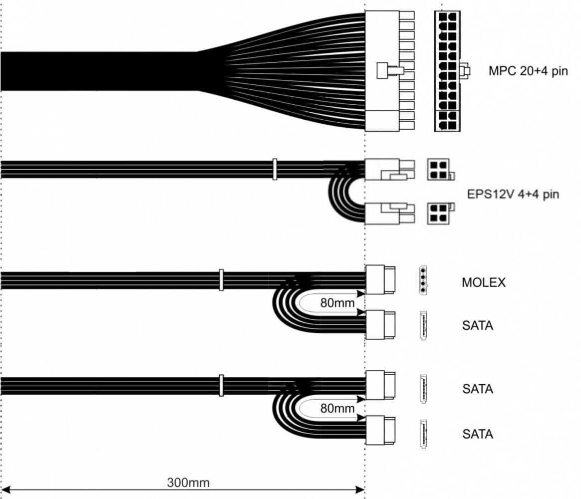 Został wyposażony w złącze 4pin, złącze MOLEX, 3 złącza SATA oraz uniwersalne 24pin do płyt głównych. Gwarantem wysokiej sprawności urządzenia jest zgodność z certyfikatem 80 PLUS Gold, dzięki której użytkownik ma pewność, że co najmniej 80% energii przekazywanej przez zasilacz jest odbierane przez podzespoły komputera, a jedynie 20% (lub mniej) energii zostaje utracone pod postacią ciepła. Efektywne chłodzenie zapewnia ośmiocentymetrowy, wydajny i cichy wentylator. Zasilacz idealnie nadaje się do obudów systemów komputerowych małych i średnich wielkości dzięki zoptymalizowanemu zestawowi kabli o długości do 36 cm. Wykonany został z wytrzymałej, ocynkowanej galwanicznie stali.