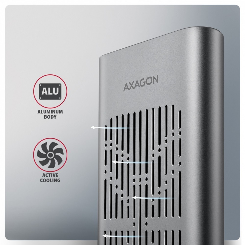 Aluminiowa obudowa wraz z podkładkami termoprzewodzącymi odprowadza ciepło z zamontowanych dysków M.2 SSD. Chłodzenie wspiera aktywny wentylator, który zapewnia ciągły przepływ powietrza wewnątrz urządzenia. Pozwala to utrzymać optymalną temperaturę pracy przy długotrwałym obciążeniu (np. podczas klonowania lub transferu dużych ilości danych). Ryzyko przegrzewania i spadku wydajności spowodowanego tzw. Thermal Throttling jest minimalne. Stabilizuje to wydajność i wydłuża żywotność dysków SSD.