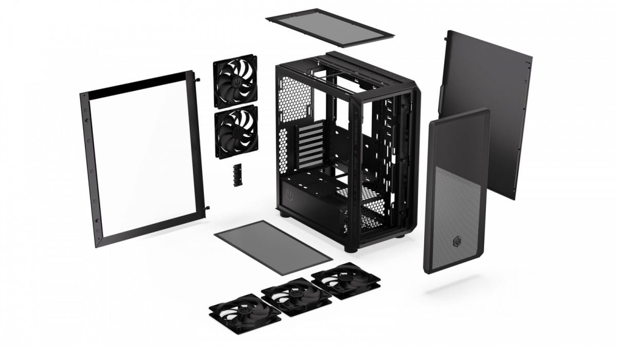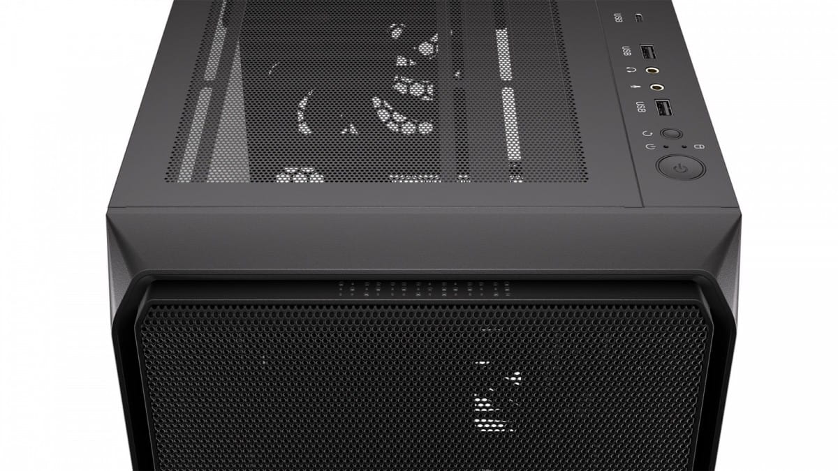 To jedna z największych (nieco krótsza od serii Arx 700) obudów, jaką stworzyliśmy. Ma 486×228×429 mm - to spokojnie wystarcza między innymi na wysoki system chłodzenia (do 179 mm), 7 wentylatorów (w tym 5 Stratusów 140 PWM masz od nas na start) i większość dostępnych na rynku kart graficznych (do 350 mm). Wszystko siedzi sobie w przyjemnym przeciągu, bo drobno perforowany przedni i górny panel wpuszczają świeże powietrze i blokują kurz. Sprawdzisz to przez okno z hartowanego szkła.