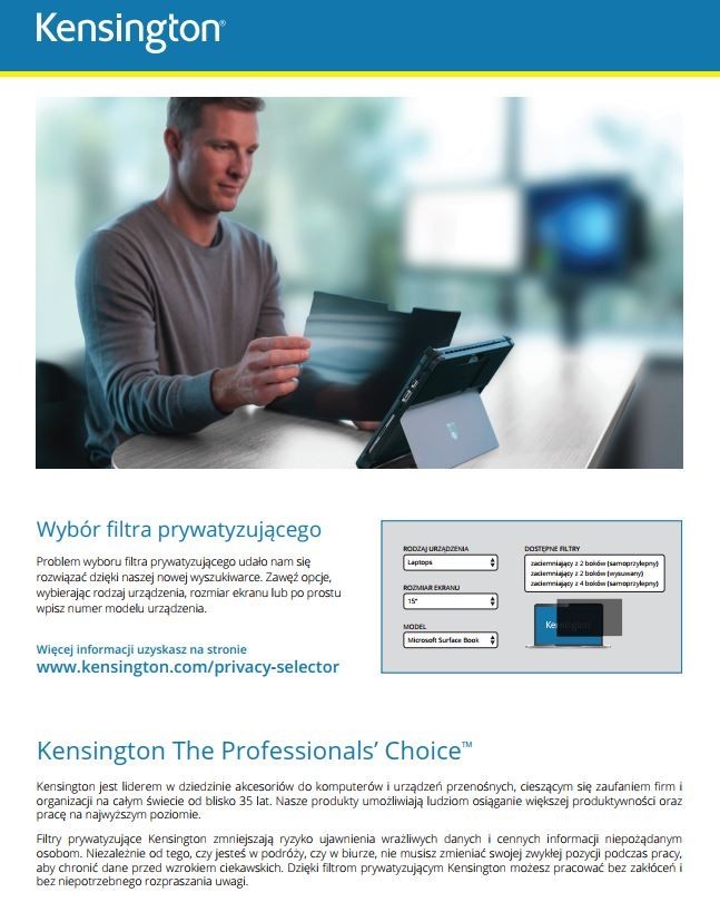 - Ogranicza kąt widzenia do +/- 30 °, ukrywając informacje osobiste lub poufne przed każdym, kto próbuje spojrzeć z boku