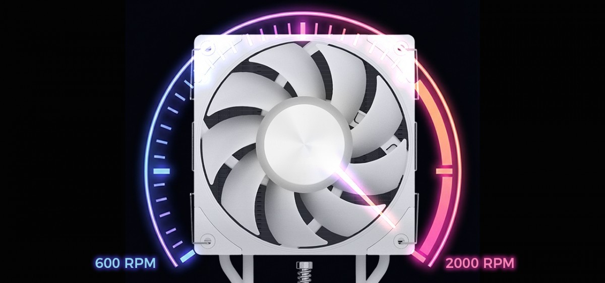 Wentylator PWM w rozmiarze 120 mm, pracuje w zakresie prędkości obrotowej od 600 (+-100) do 2000 (+-10%) RPM. Prędkość ustawić można na krzywej obrotów wentylatora, dlatego zakres chłodzenia jest już w Twoich rękach.