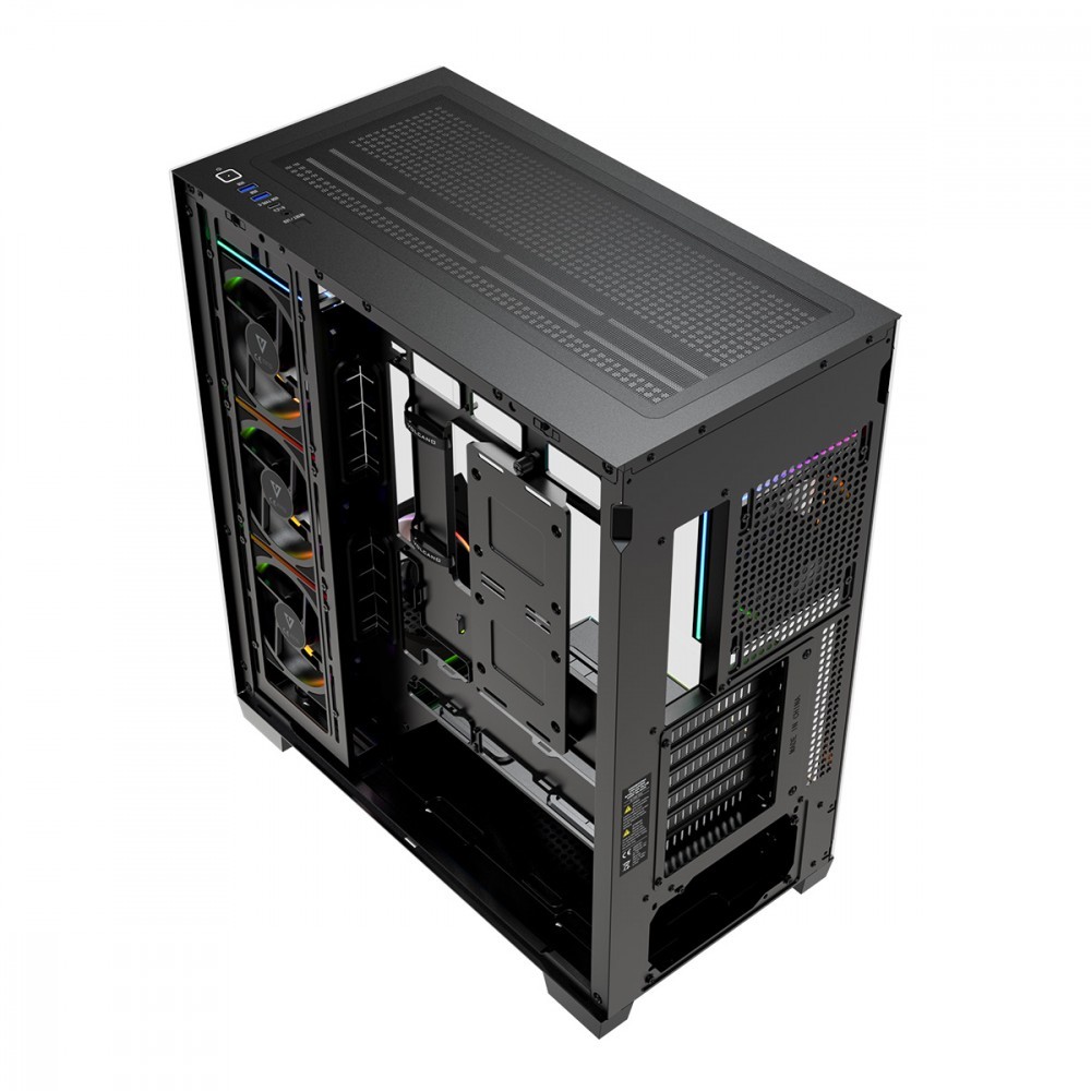 Pięć wentylatorów PWM ARGB w standardzie. Obudowa gotowa jest do montażu podzespołów po wyjęciu z pudełka. Kontroler wentylatorów w standardzie. Efektowny pasek LED ARGB na tunelu zasilacza.