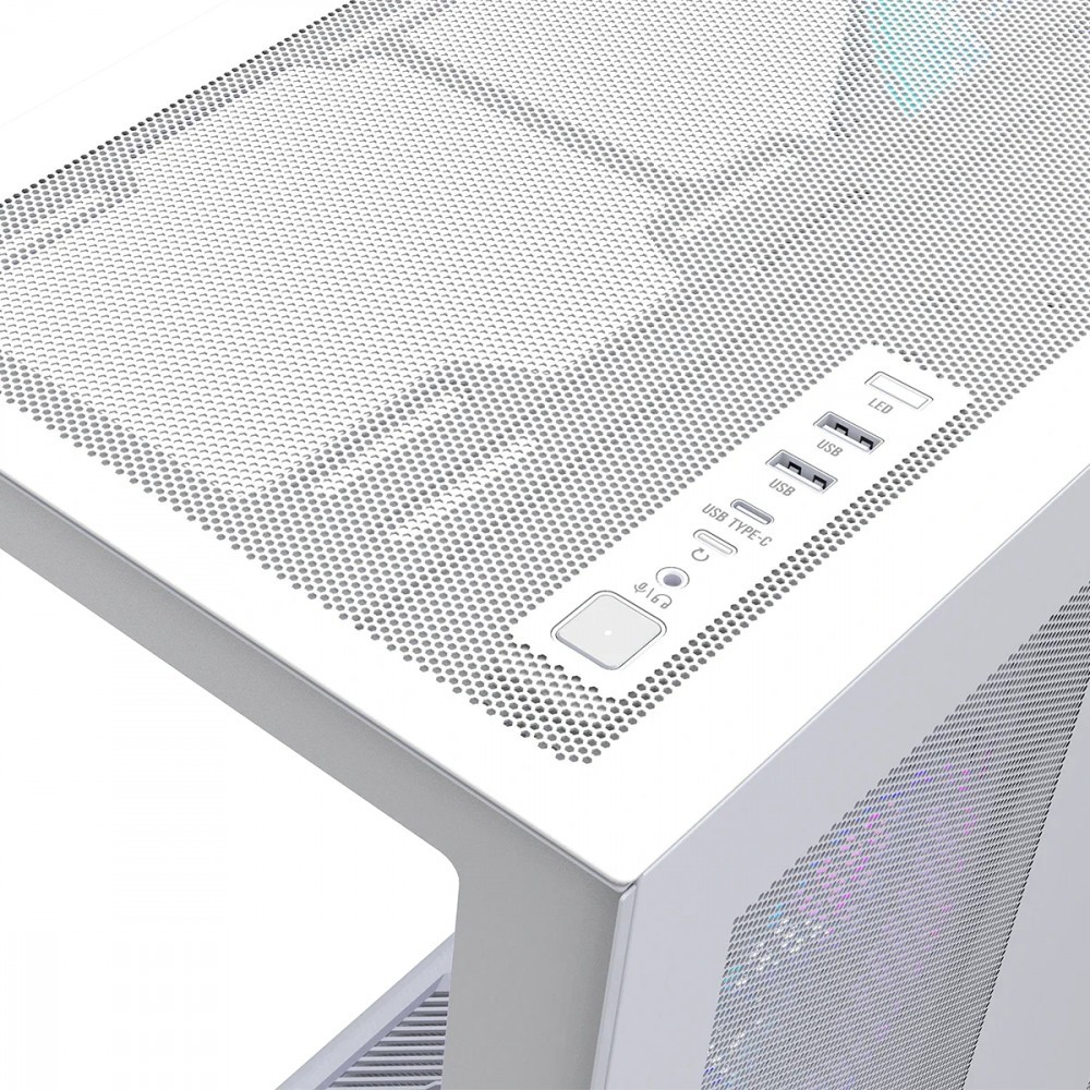 Złącza na przednim panelu: 1 x mikrofon/słuchawki (combo), 2 x USB 3.0, Sterowanie światłem, 1 x USB 3.2 Gen 2 Type-C