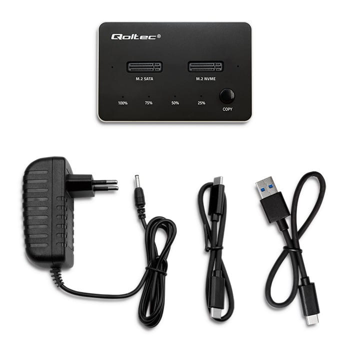 Stacja jest kompatybilna z dyskami M.2 o interfejsie SATA oraz NVMe. Oferuje szybkość transmisji danych do 10 Gb/s. Dodatkowo stacja dysków marki Qoltec to urządzenie: