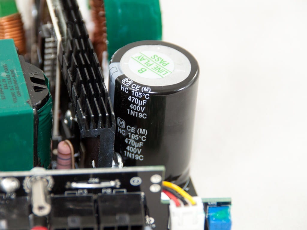 Wysokiej jakości kondensator główny 105`C / 270° uF (w modelu RAPTOR 500) poprawia trwałość zasilaczy i zapewnia stabilność i niezawodność serii zasilaczy RAPTOR. W przetwornicach obniżających napięcie z +12V na +5V i +3,3V zastosowano kondensatory polimerowe, które charakteryzują się bardzo małymi stratami.