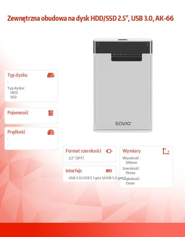 Obudowa na dysk HDD / SSD 2.5" Savio AK-66 to urządzenie, które zapewnia niezawodną ochronę dysków przechowujących Twoje dane. Dzięki transferowi o prędkości 5 Gbps możesz cieszyć się szybkim i płynnym przesyłaniem plików.
