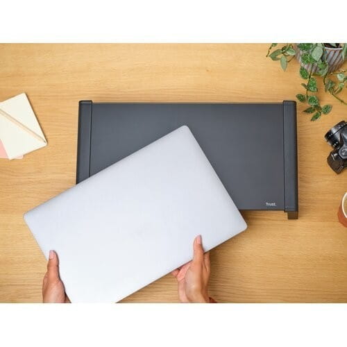 Monta to podstawka z płytą górną wykonaną ze szkła hartowanego, która umożliwia ergonomiczną i wydajną pracę dzięki dużej powierzchni wynoszącej 41 x 22 cm, co gwarantuje wystarczająco dużo miejsca, aby pomieścić laptop lub monitor i zapewnić użytkownikowi lepszy kąt widzenia. Po ustawieniu na niej laptopa lub monitora podstawka zapewnia dodatkowy poziom miejsca pod spodem, dzięki czemu można pod nią łatwo przechowywać klawiaturę lub inne akcesoria, gdy nie są potrzebne.